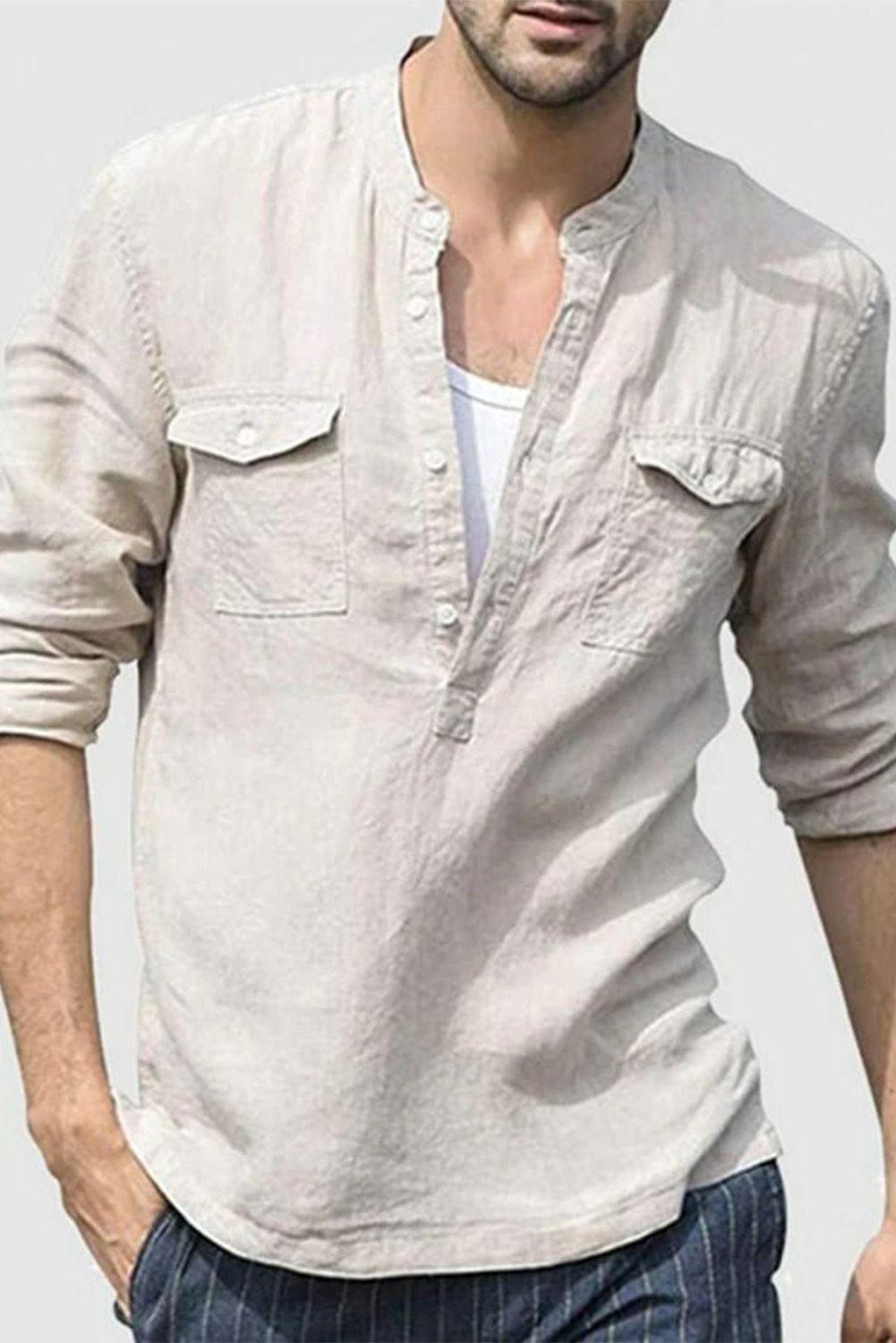 Beige Men's Baseball Letter Graphic Print Buttoned Long Sleeve Shirt
