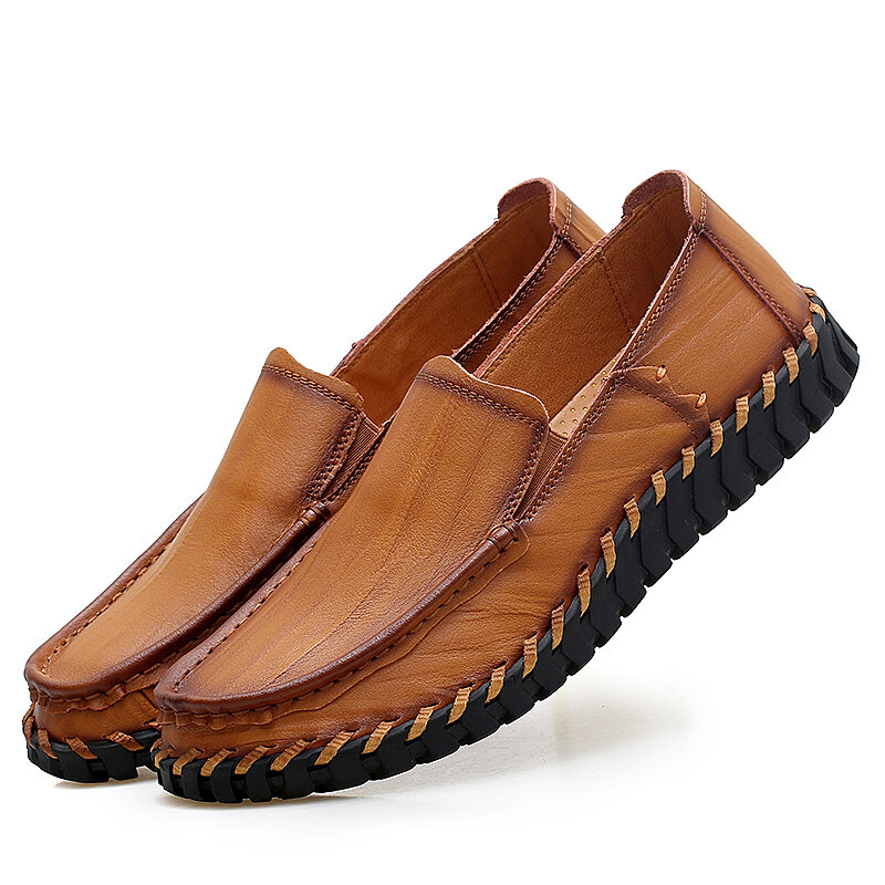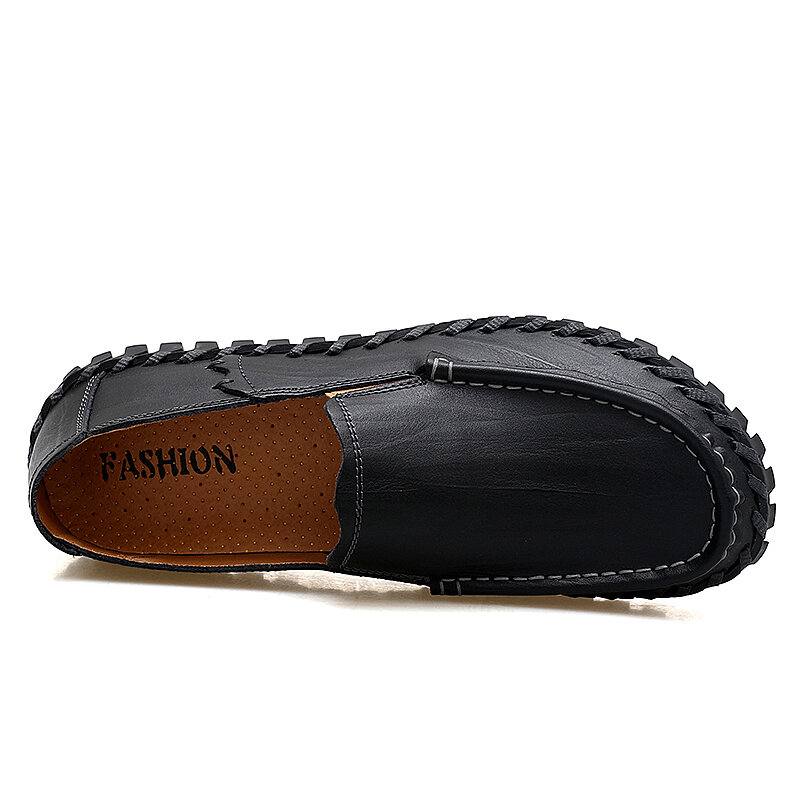 Men Cowhide Leather Hollow Out Breathable Hand Stitching Soft Sole Slip On Casual Shoes