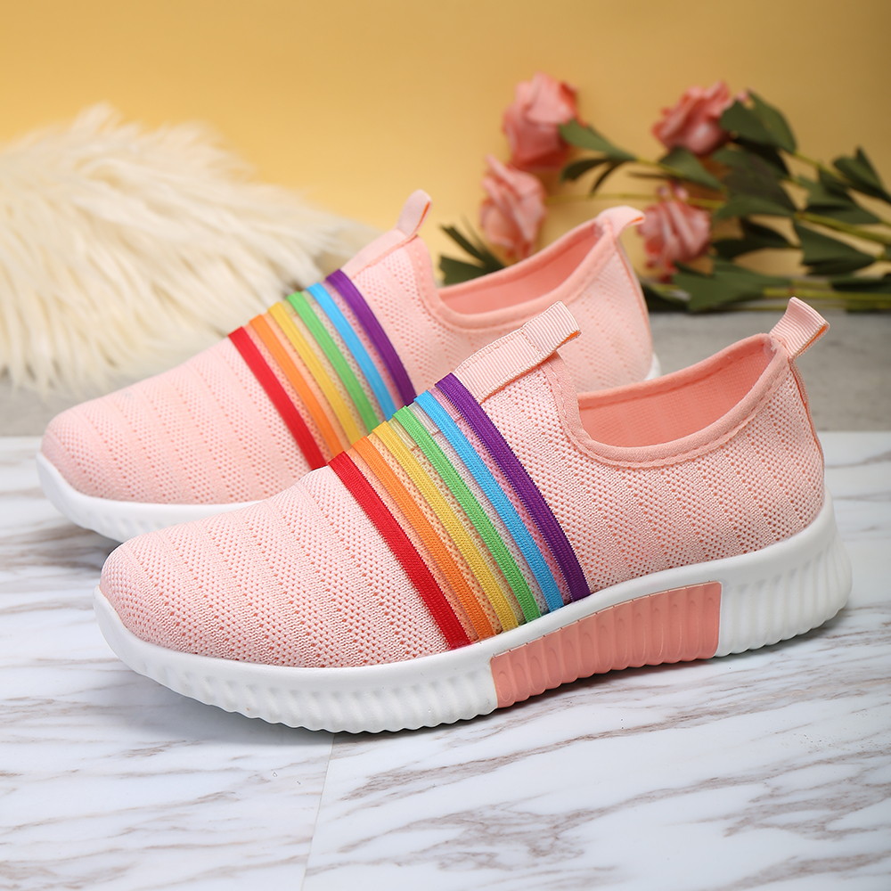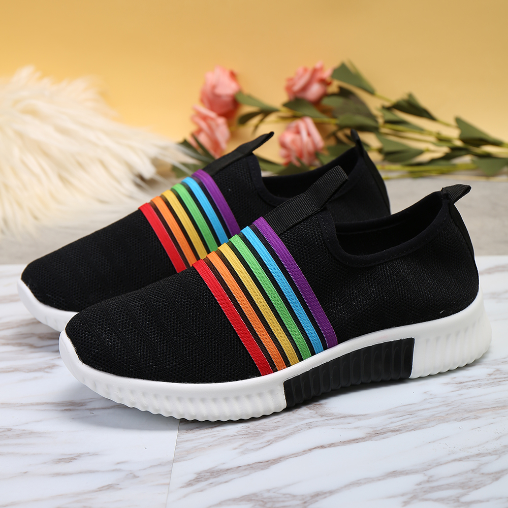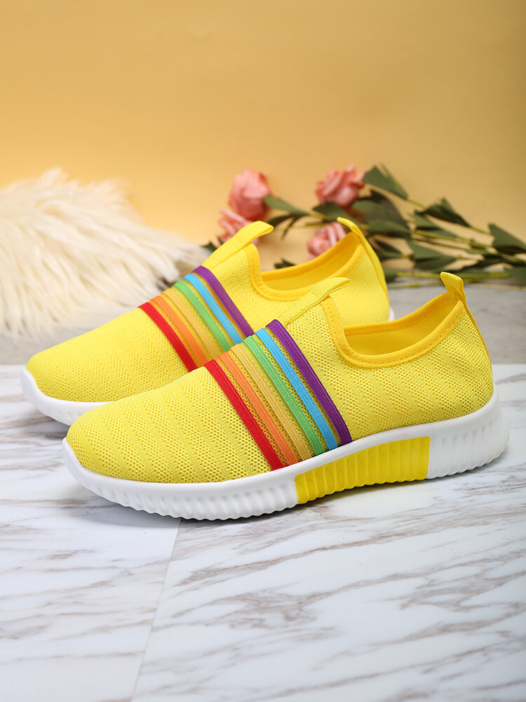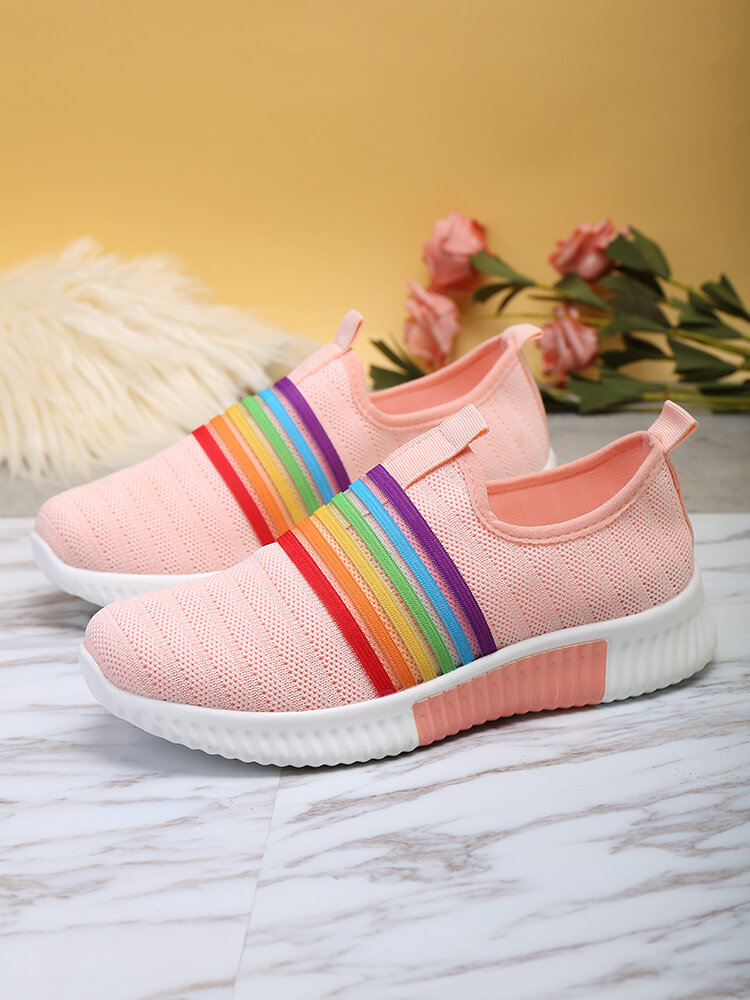 Plus Size Women Rainbow Stripe Knitted Breathable Casual Walking Shoes